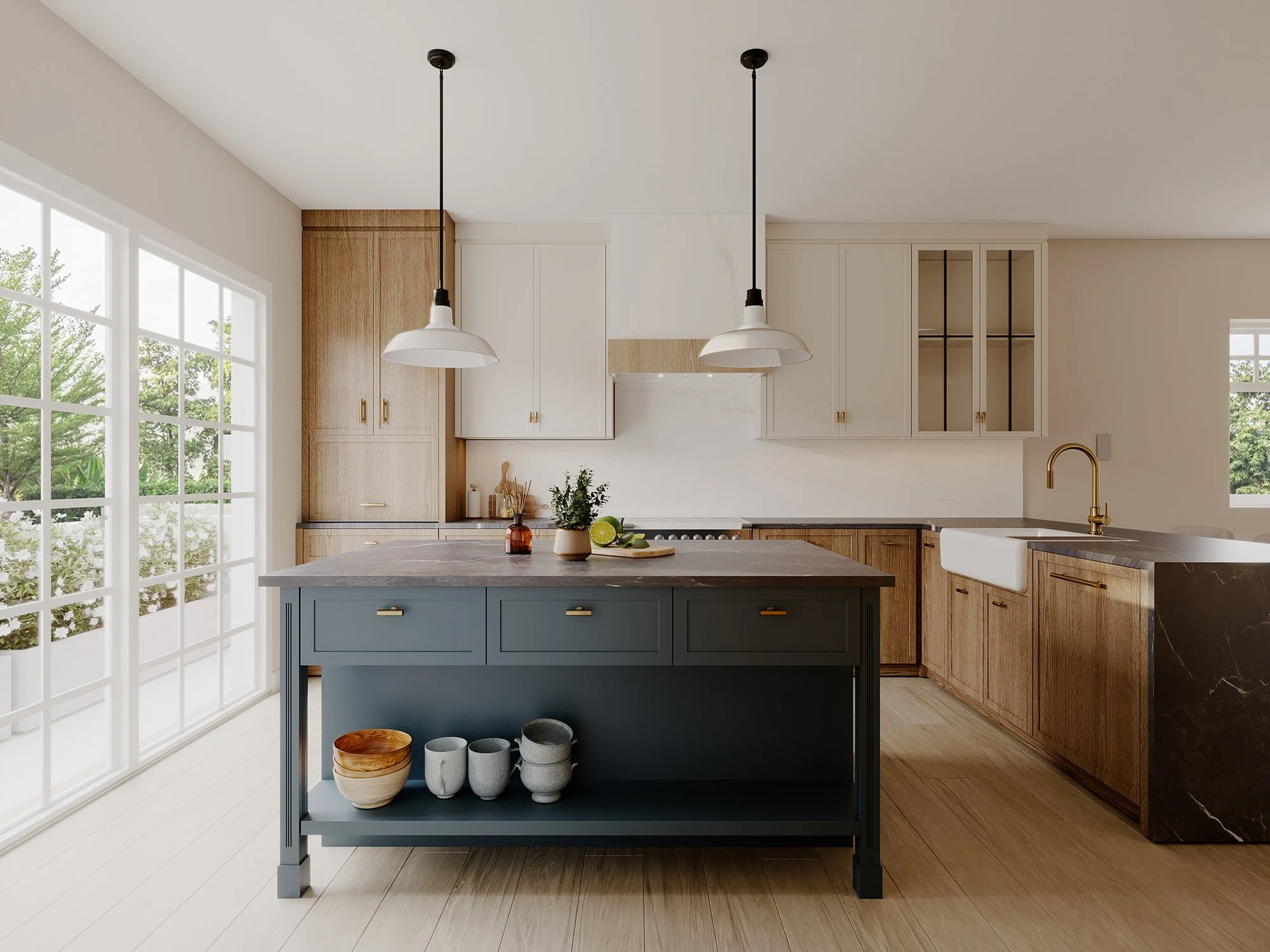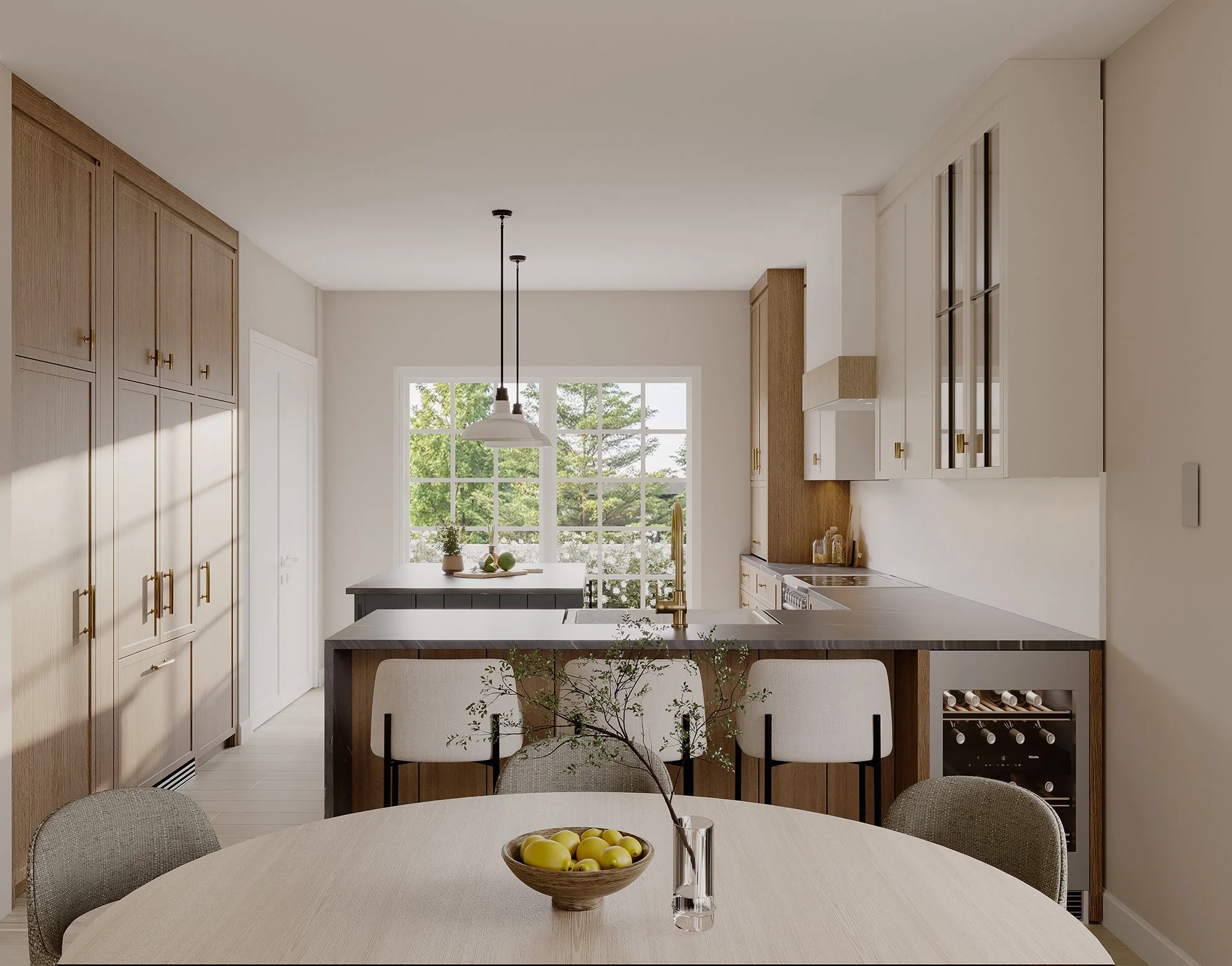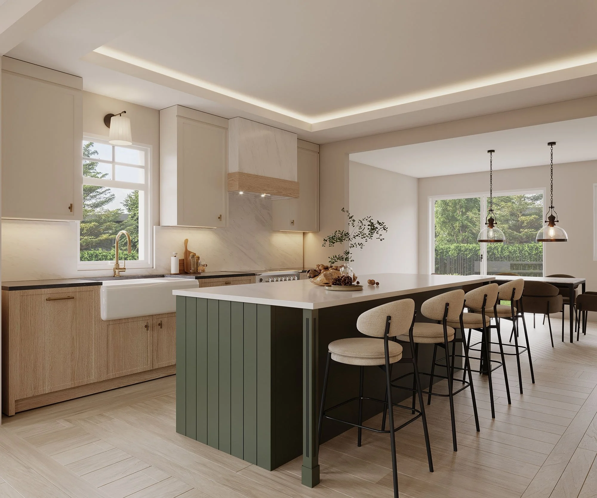 Modern kitchen with an island, beige cabinets, white farmhouse sink, pendant lights, and a dining area with large windows and outdoor view.
