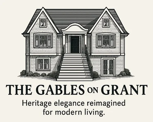 Black and white illustration of a large house with stairs leading to an entrance, paired with the text "The Gables on Grant" and the tagline "Heritage elegance reimagined for modern living."