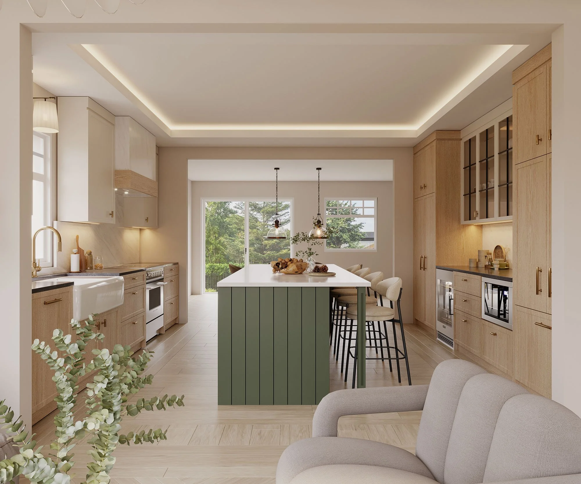 Open-concept modern kitchen with light wood cabinetry, a green kitchen island, and barstools. Features a white countertop, pendant lights, and large window with outdoor view.