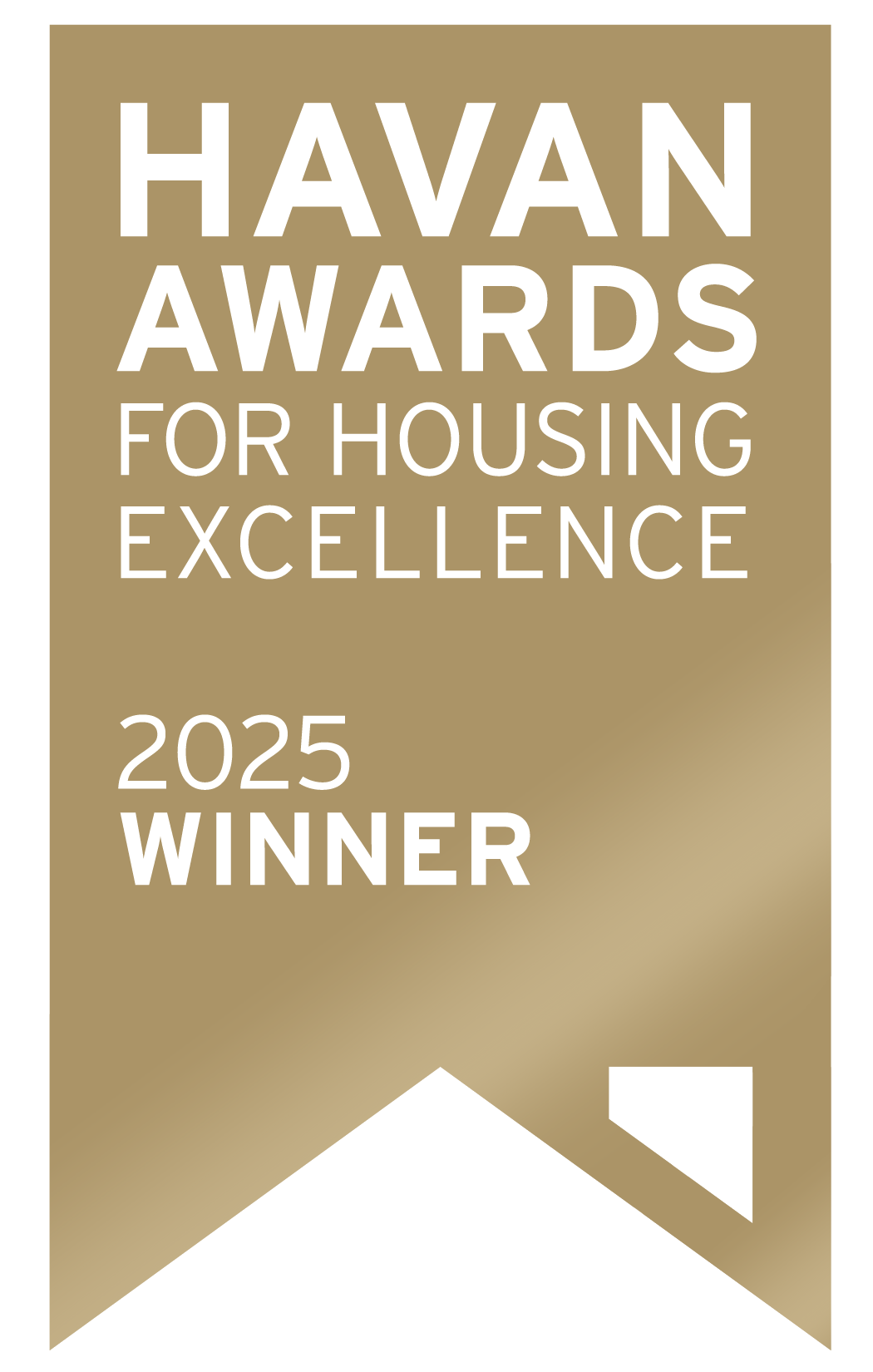 Havan Awards for Housing Excellence 2025 Winner trophy plaque with a gold background and white text.
